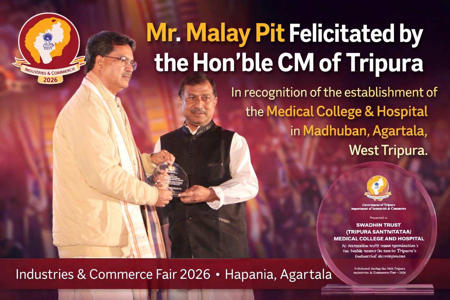 Tripura Santiniketan Medical College & Hospital achieved a moment of pride and recognition as its President, Mr. Malay Pit, was felicitated by the Hon’ble Chief Minister of Tripura during the Grand Inauguration Ceremony of the 36th Tripura Industries & Commerce Fair 2026, held at Hapania, Agartala.