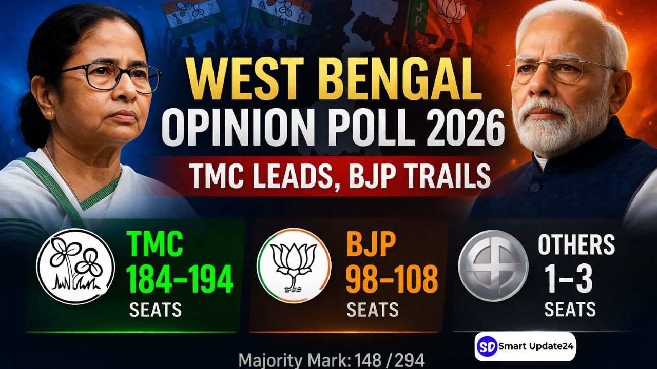 West Bengal Opinion Poll 2026: In the 294-member Legislative Assembly, the party led by Mamata Banerjee is projected to win between 184 and 194 seats—a figure well above the majority mark. The BJP is projected to secure 98 to 108 seats, while smaller parties are expected to remain on the margins.